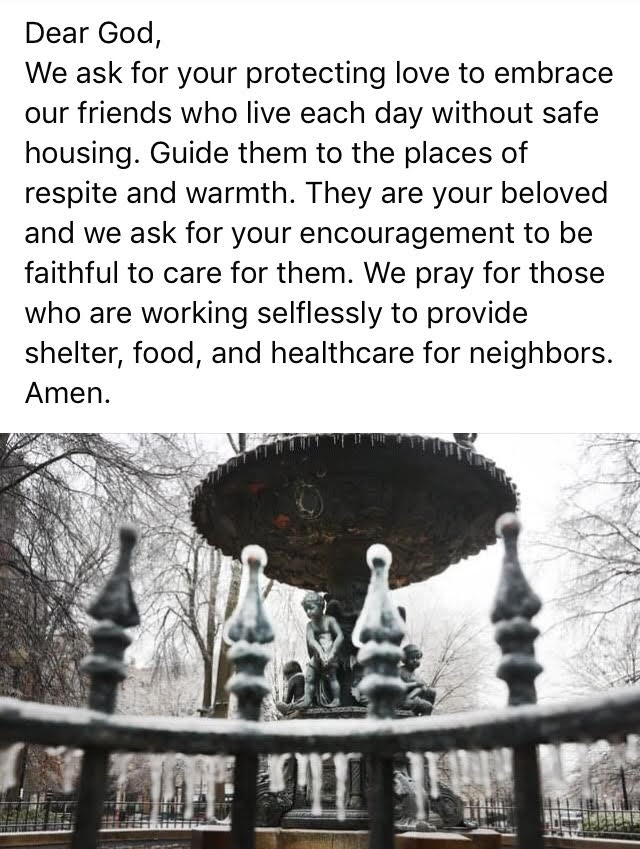 Today’s prayer comes from Room In the Inn Memphis. Please keep all of our brothers and sisters who are facing the brutal temperature and winter weather in your prayers. To find out more information and to support Room In The Inn Memphis visit http://www.roomintheinn-memphis.org