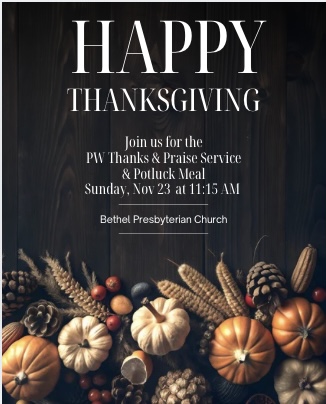 November 23rd Service Posted by bethelpcusa on November 22, 2025 Hope to see you tomorrow for the Thanks and Praise Service! Share this: Click to share on X (Opens in new window) X Click to share on Facebook (Opens in new window) Facebook Like Loading... Related